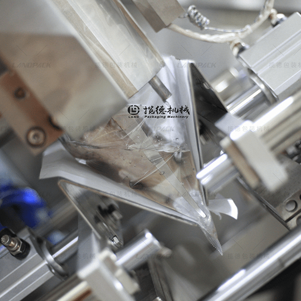 因為是充氣包裝活魚之類的生鮮物料,采用傾斜式倒料機構,可以有效防止袋子封口裂開,還可以防止活魚在下料過程產生撞擊,保證了存活率。