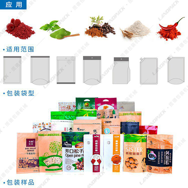 粉末給袋式包裝機(jī)適用于包裝易流動(dòng)或者流動(dòng)性極差的粉末及小顆粒物料,如奶粉、蛋白粉、可可粉、添加劑,粉劑、小顆粒劑藥品,獸藥、葡萄糖、調(diào)味品、固體飲料、碳粉、爽身粉、農(nóng)藥等;