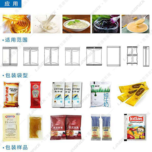 涼皮調(diào)料包裝機(jī)適用于番茄醬、洗發(fā)水、涼皮調(diào)料、蜜糖、食用油、果汁、五味醬、蟹肉蘸醬、麻婆醬、炸醬、XO醬、咖喱醬、南洋蝦醬、芥末醬、香草醬、蒜蓉醬、涼拌醬、壽司醋、黑胡椒醬汁、茄汁醬、蘸醬等液體醬料類物料包裝。