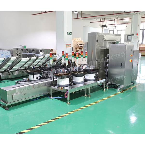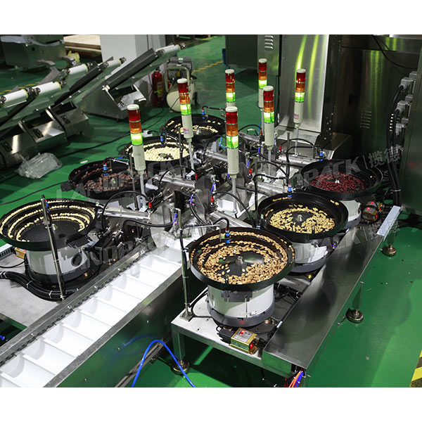 該臺(tái)每日堅(jiān)果包裝機(jī)是由水平給袋式包裝機(jī)主機(jī)、Z型自動(dòng)上料機(jī)、震動(dòng)盤三大件組成的,該機(jī)的工作流程是:操作人員把物料倒入震動(dòng)盤當(dāng)中,一袋包裝多少種物料,就配置多少個(gè)震動(dòng)盤,震動(dòng)盤把物料輸送到傳送帶當(dāng)中,在通過Z型上料機(jī)把物料輸送到袋子當(dāng)中,然后進(jìn)行下料,充填、打碼、封口等一系環(huán)節(jié)完成包裝過程。
